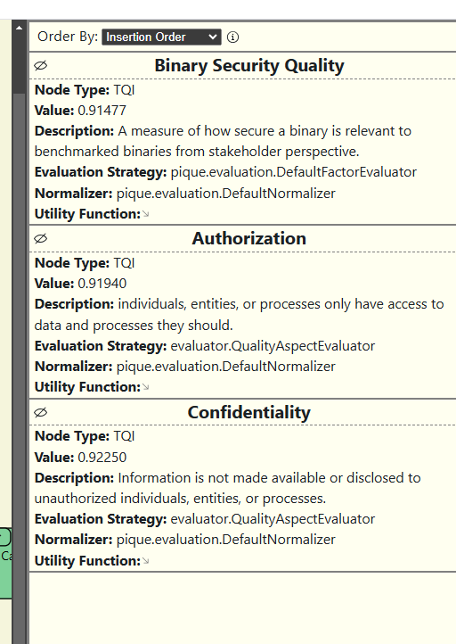 When the user first opens the List View, all sections are collapsed by default. Only the root node (e.g., Binary Security Quality) is visible. Expanding the root reveals all Quality Aspects, while deeper levels remain hidden. Each level is visually indented beneath its parent node, helping users understand the hierarchical structure of the model. For example, all Quality Aspects (such as Availability, Authenticity, etc.) appear slightly indented beneath “Binary Security Quality,” indicating that they are its direct children.